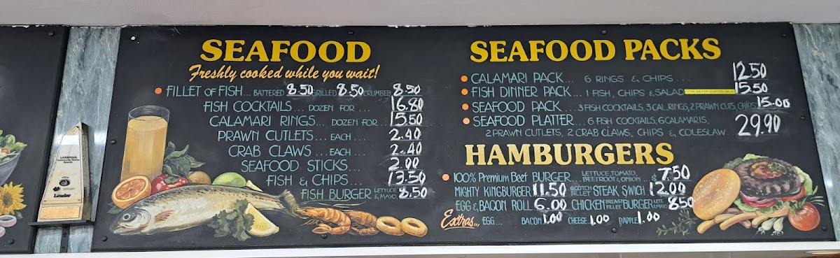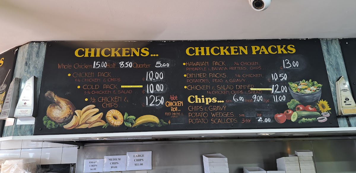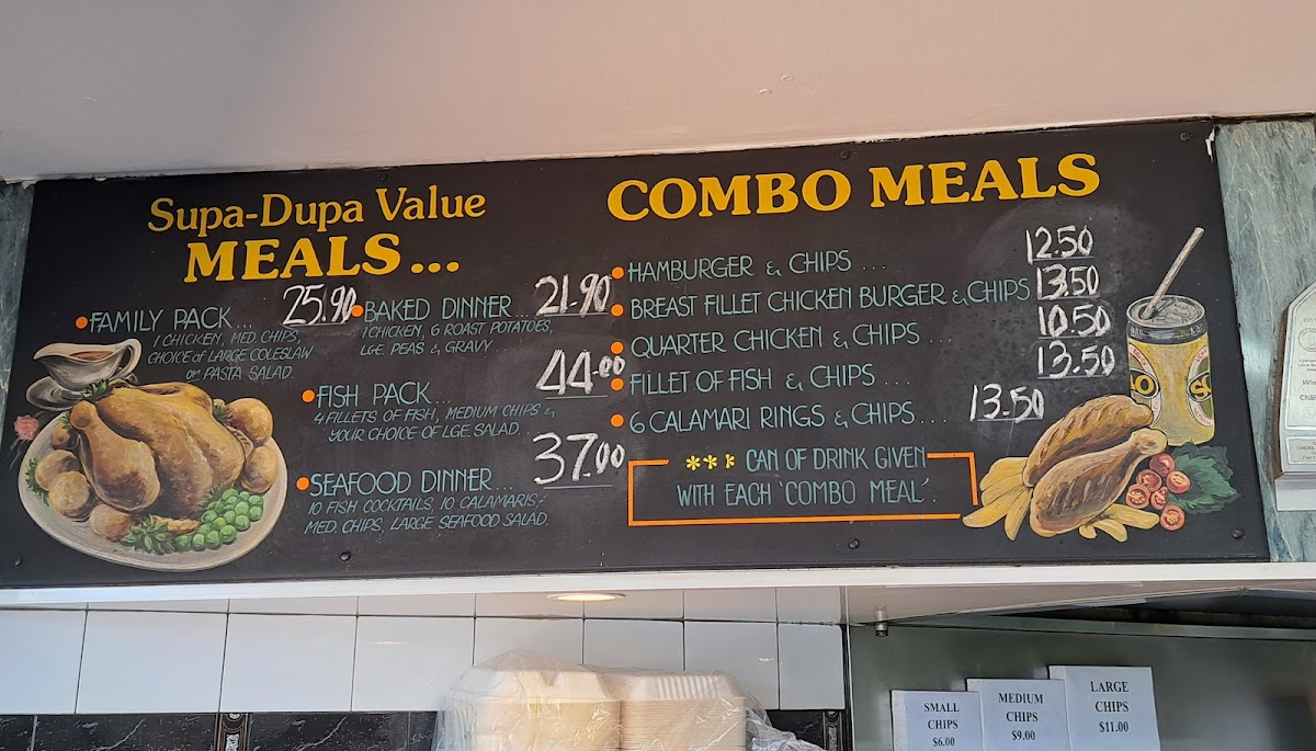 From a reviewer’s perspective, the menu at Casula Chicks & Seafood offers a straightforward and satisfying range of classic takeaway favorites, with combo options like Hamburger & Chips, Quarter Chicken & Chips, and Fillet Of Fish & Chips providing convenient, well-rounded meals. The chicken selection is solid, featuring options such as Chicken Pack and 1/2 Chicken & Chips, while the chicken packs like Hawaiian Pack and Chicken & Salad Dinner add variety for those wanting a more complete meal. Seafood lovers are well catered for with items like Fillet Of Fish, Fish Cocktails, Calamari Rings, Prawn Cutlets, and Crab Claws, along with larger options such as the Calamari Pack, Seafood Pack, and Seafood Platter for sharing. The menu also includes simple favorites like the Egg & Bacon Roll and sides such as Chips & Gravy and Potato Wedges, making the overall selection balanced, familiar, and suitable for a quick, filling meal.